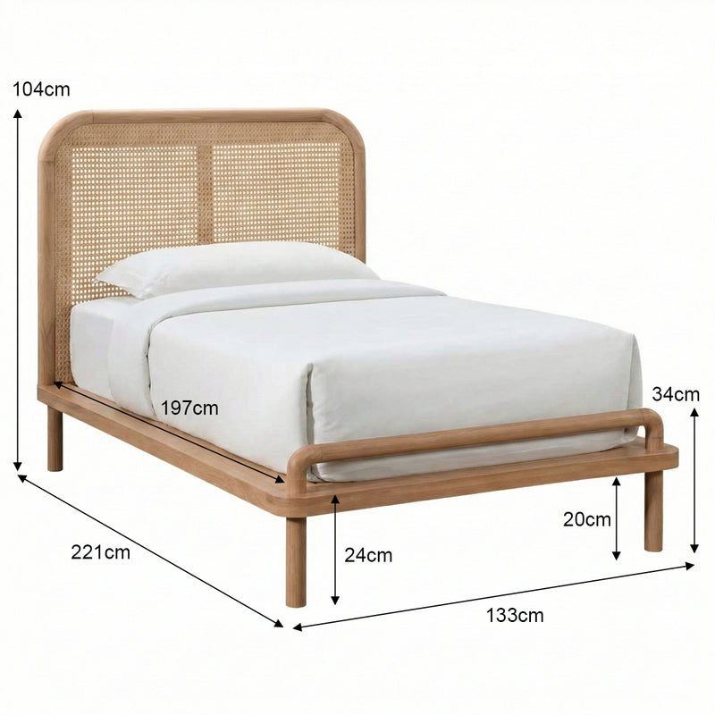Solid oak construction, platform base, fisheye weave natural rattan headboard, timber bar detail, hard-wearing PU lacquer finish, simple assembly required, all hardware included.