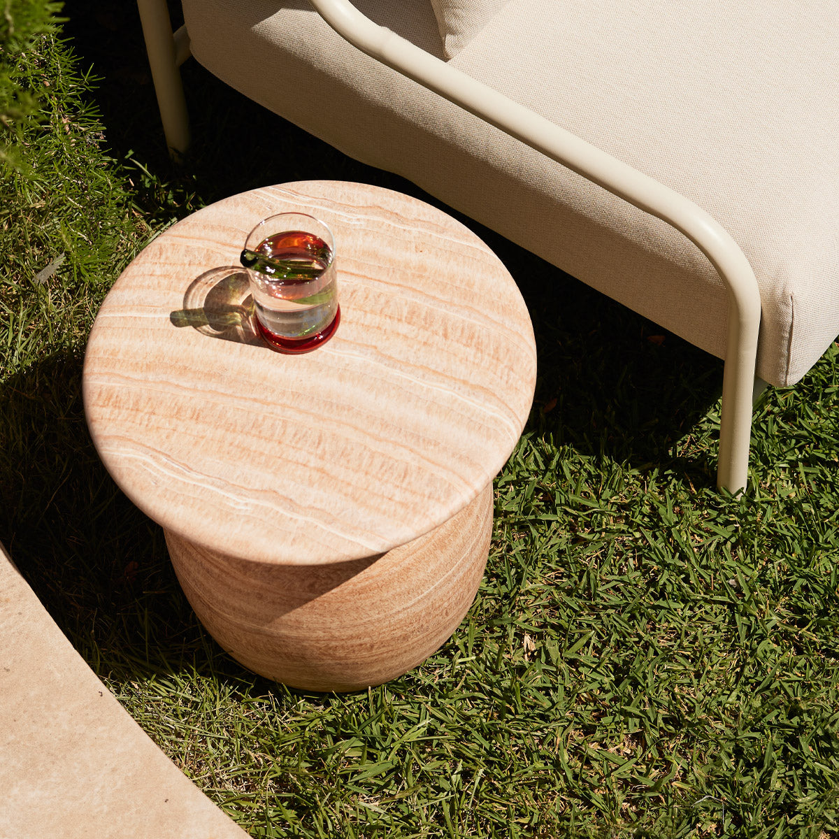 With its soft curves and minimalist form, the Sol Side Table brings a grounded elegance to any setting. Crafted with an elevated travertine-look finish, its sculptural silhouette balances a rounded base with a perfectly proportioned circular top. Designed for both indoor and covered outdoor use, the Sol is as functional as it is beautiful and is ideal to use as a side table, accent piece, or stylish pedestal.