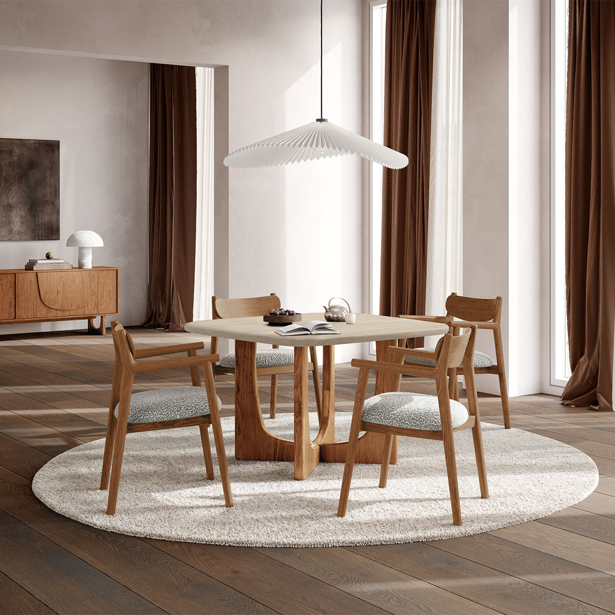 Circular Bianco Oak timber tabletop with a soft lacquer finish, natural stone detailing with subtle tonal variations.