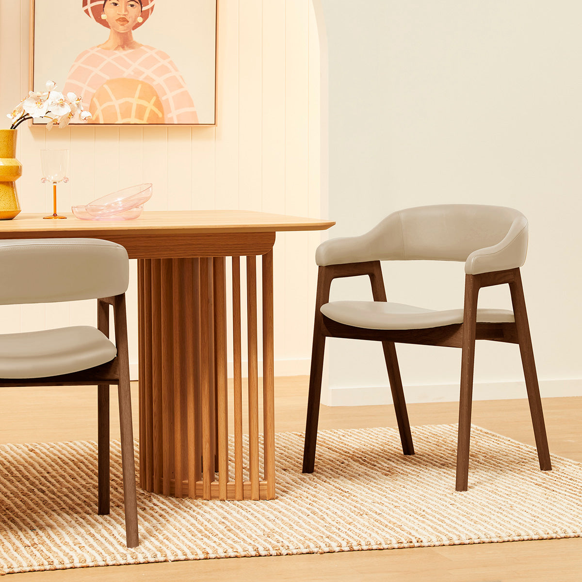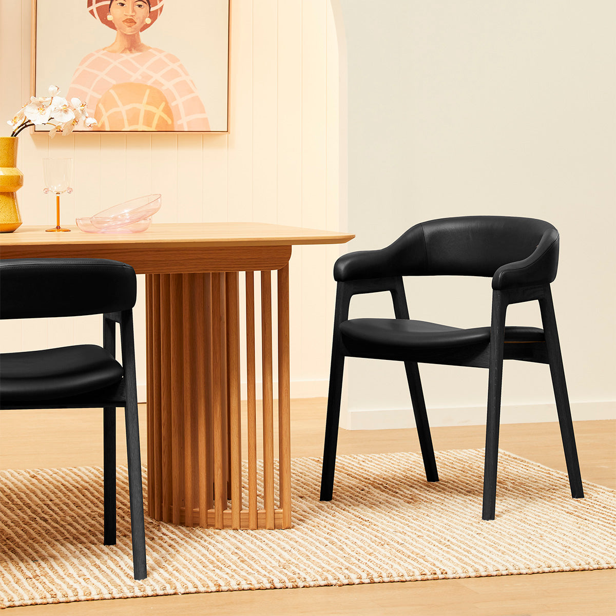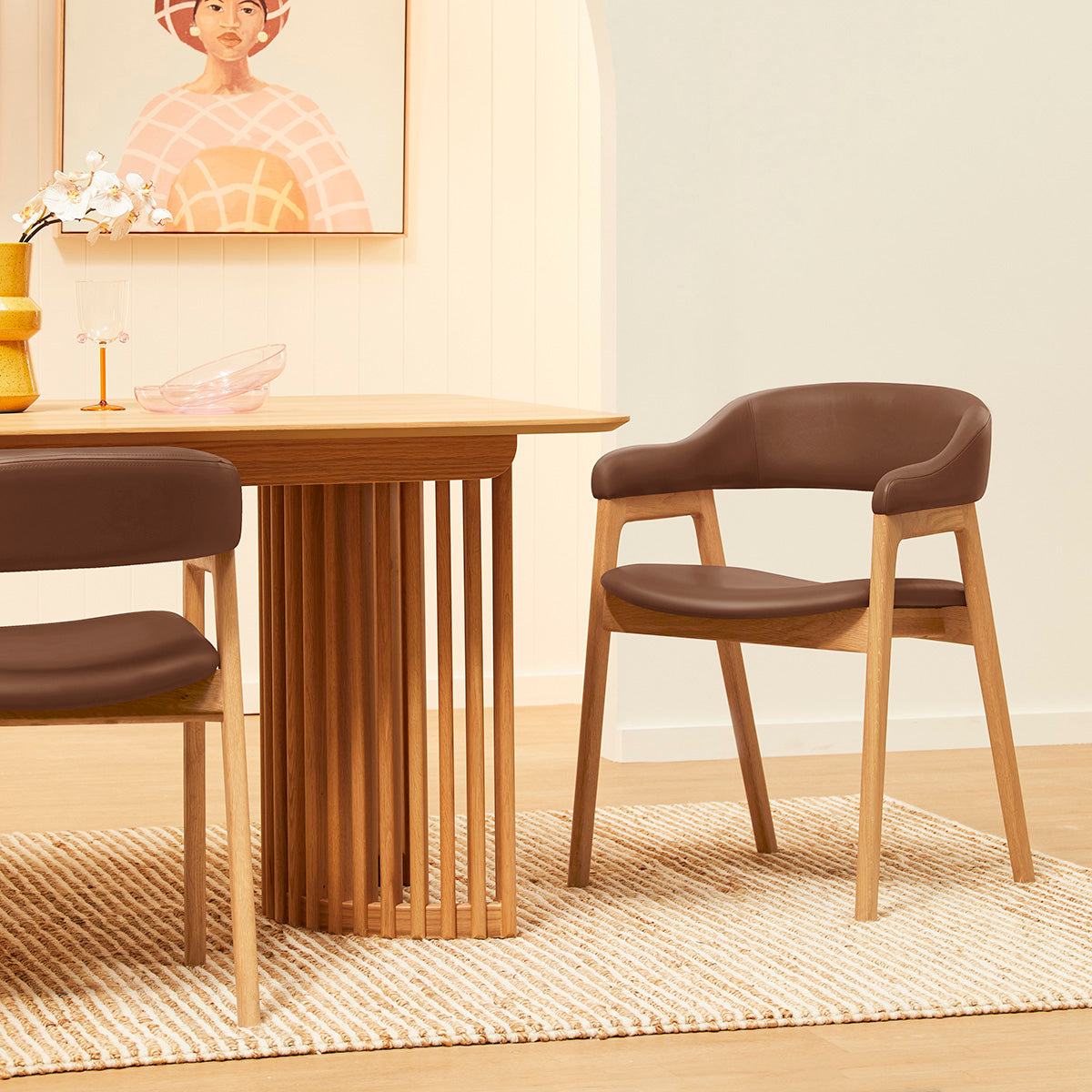 Contemporary in design, the Santino Leather Dining Arm Chair is the perfect piece to elevate any dining space. Crafted from solid oak timber, its sturdy frame features a gracefully curved form designed to provide optimal comfort and style. The seat, back and armrests are covered in a smooth leather upholstery, finishing the chair with a stunning contrasting texture.