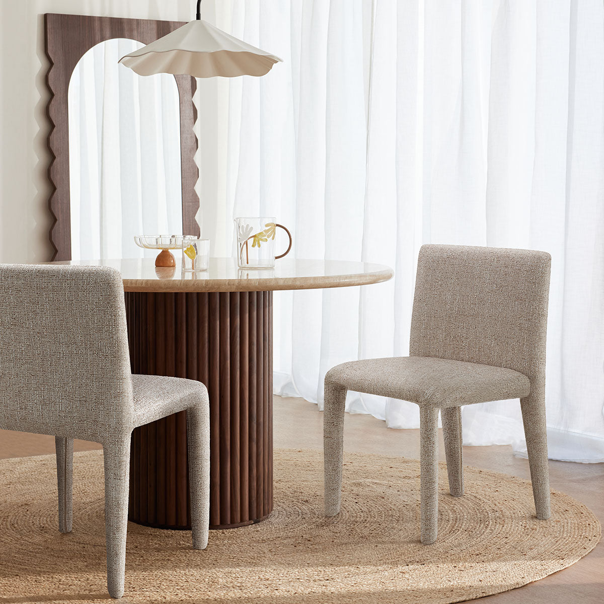 The Sofia Dining Chair is a contemporary statement piece with an elevated aesthetic and tactile finish. Covered in a textured fabric upholstery from top to toe, its plush cushioned design brings comfort and ease to any dining space. Versatile and stunning, the Sofia will work with almost any dining table, whilst effortlessly adding interest to your space.