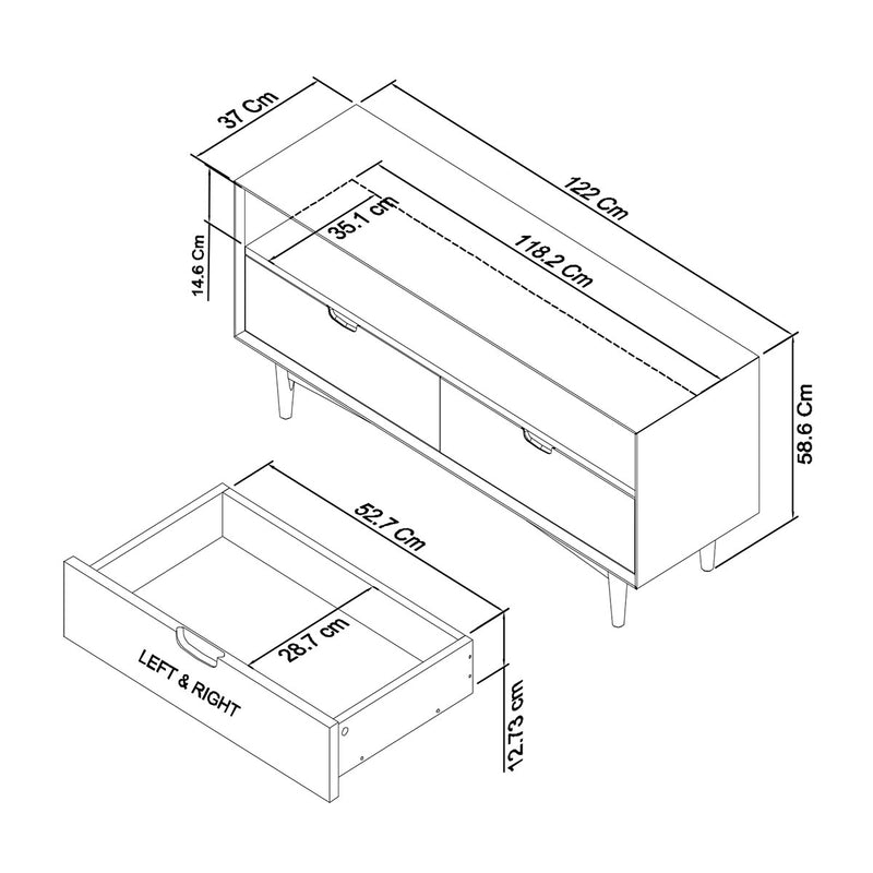 Media Shelf: 118.2W x 35.1D x 14.6H cm -
