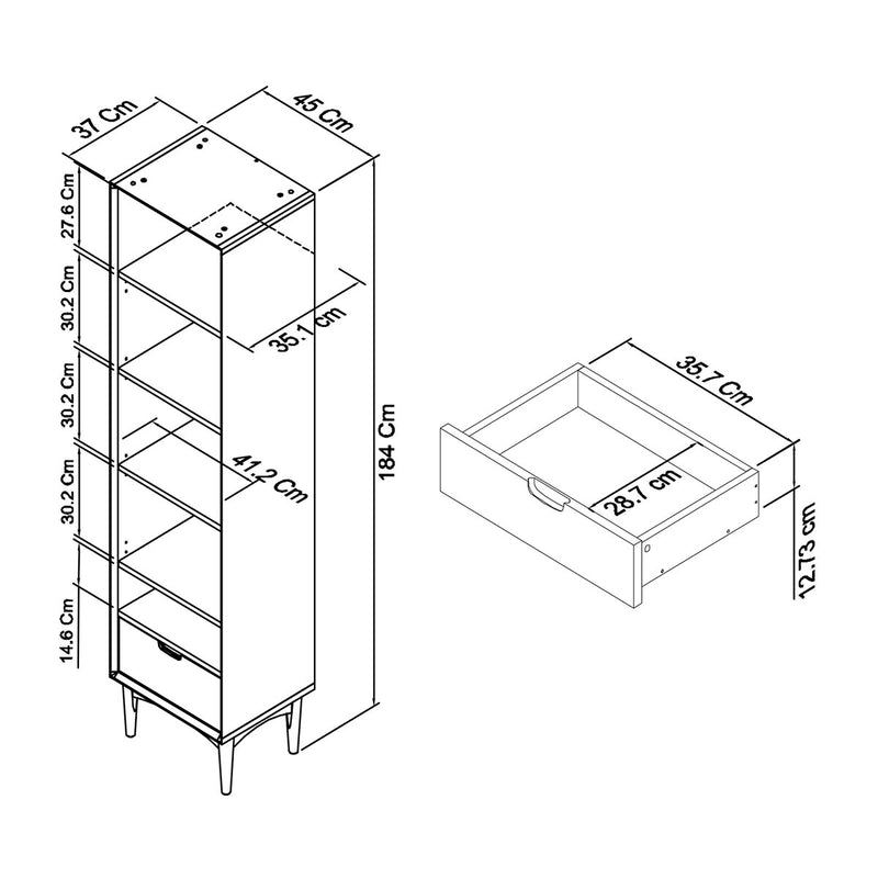 Mid-century inspired with hints of both retro and Scandinavian design; engineered miter joints; tapered legs; 5-level open shelving and additional drawer at the bottom with wooden scallop design handles.