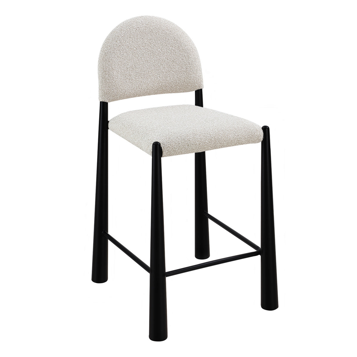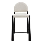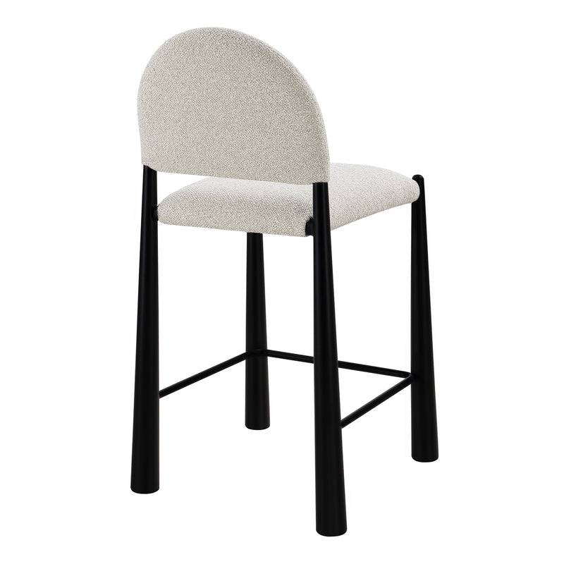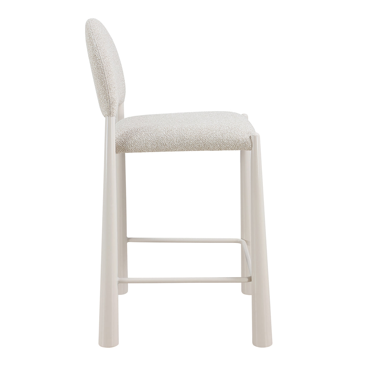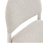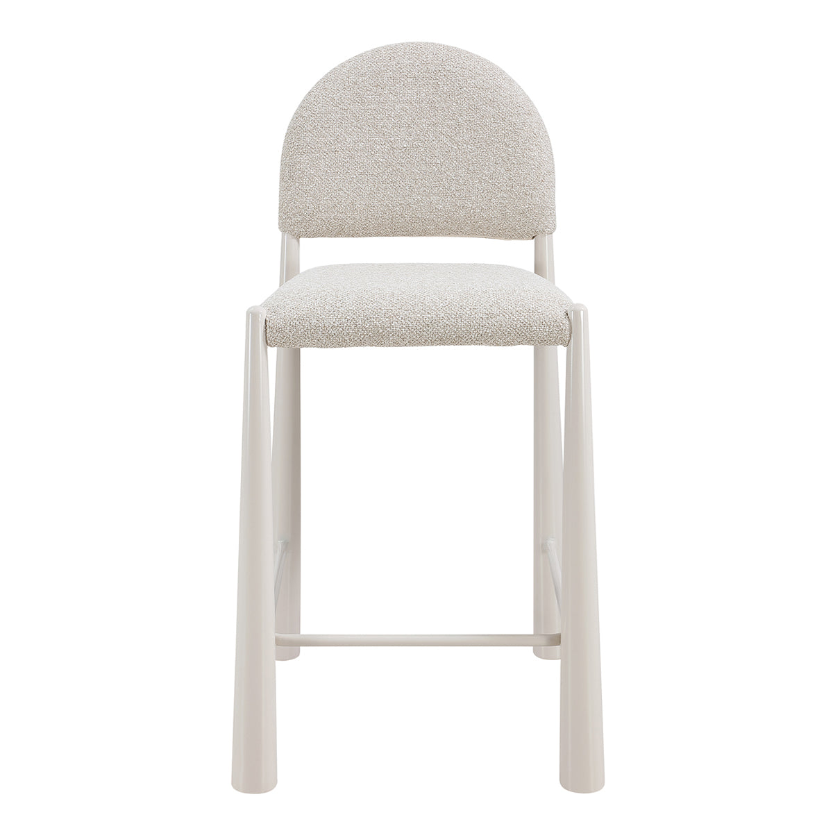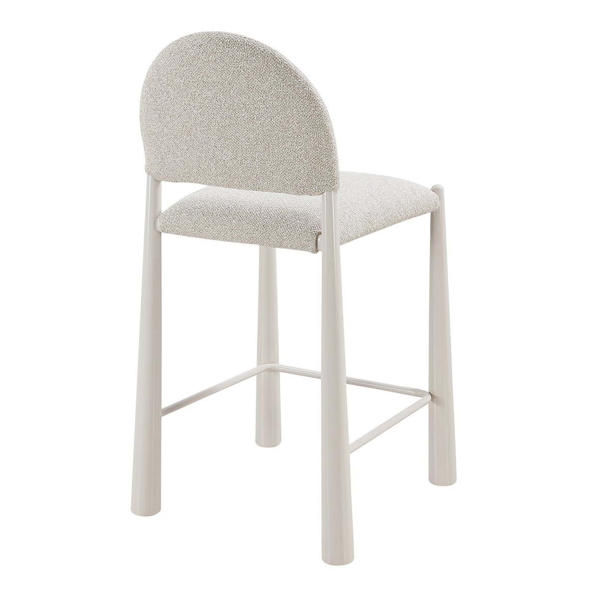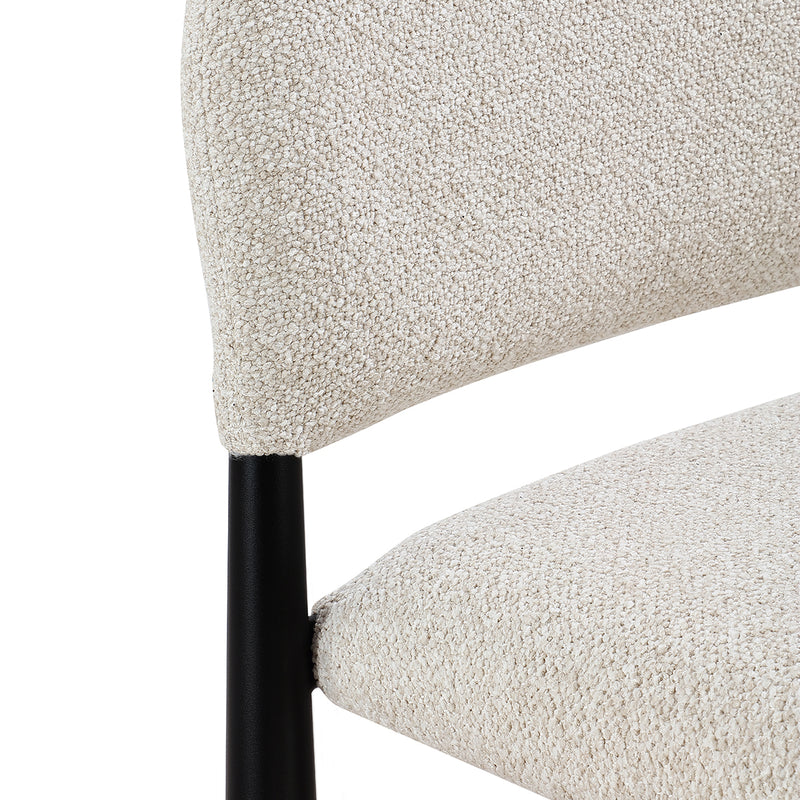 Boucle upholstery, steel legs, arched backrest, available in various colourways.