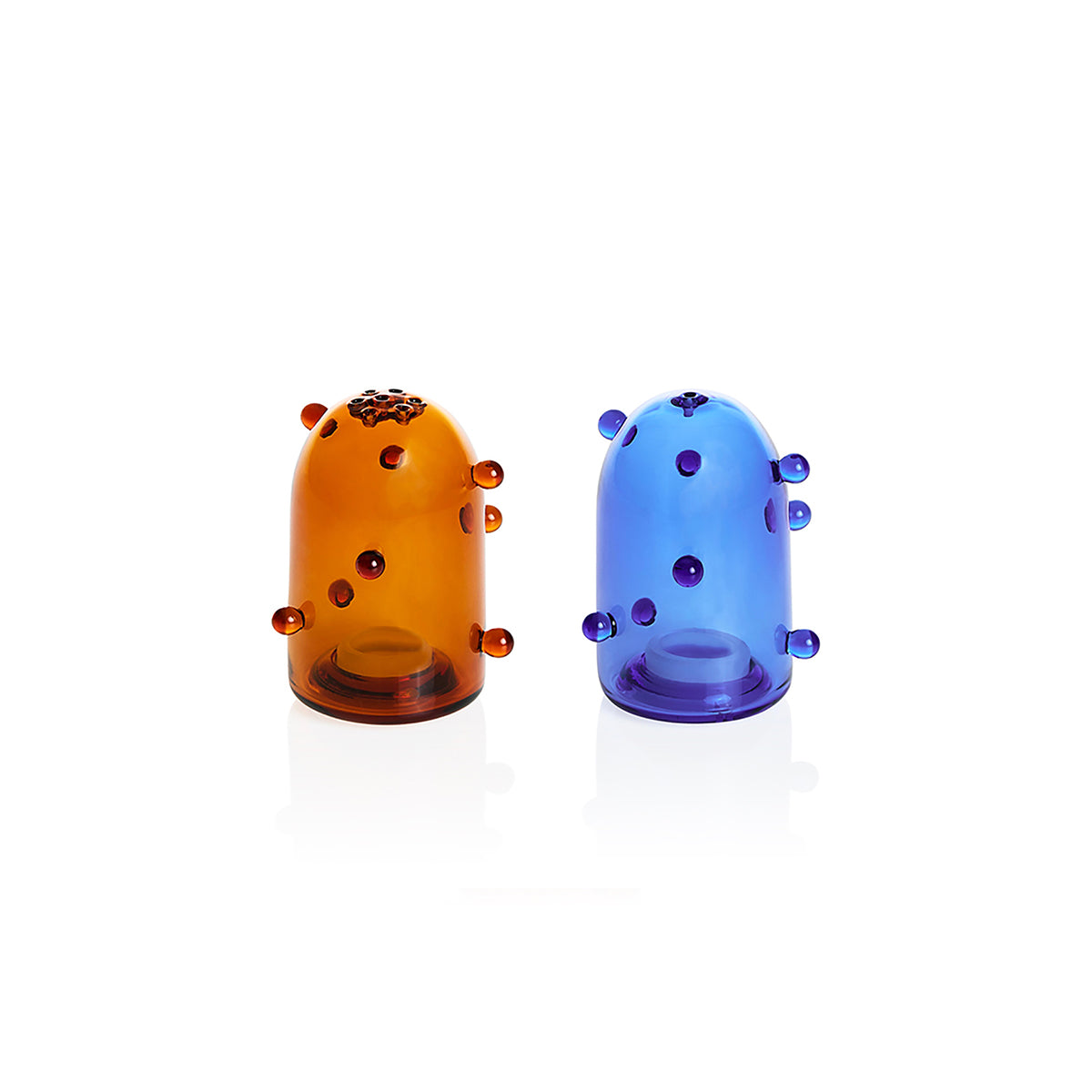 Salt and pepper set available in blue and brown colour. Our glassware is hand blown, and as a result slight variances in shape, size and colour may occur. These variances are part of the inherent charm of handmade products, and should not be considered a fault. Any irregularities that may occur will never deter from the overall aesthetic of the product, or hinder its ability to be used as intended.
