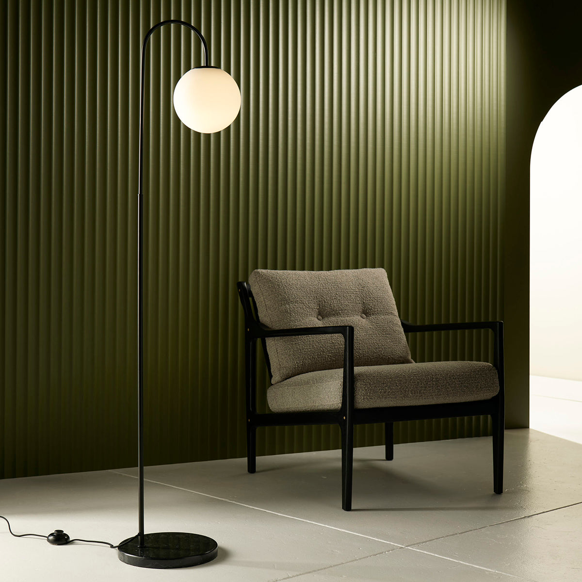 Powdercoated metal floor lamp with black marble base and a glass globe.