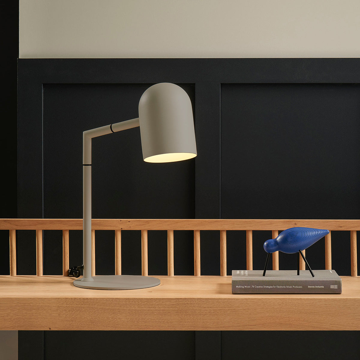 Powdercoated metal desk lamp in sage green.