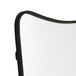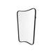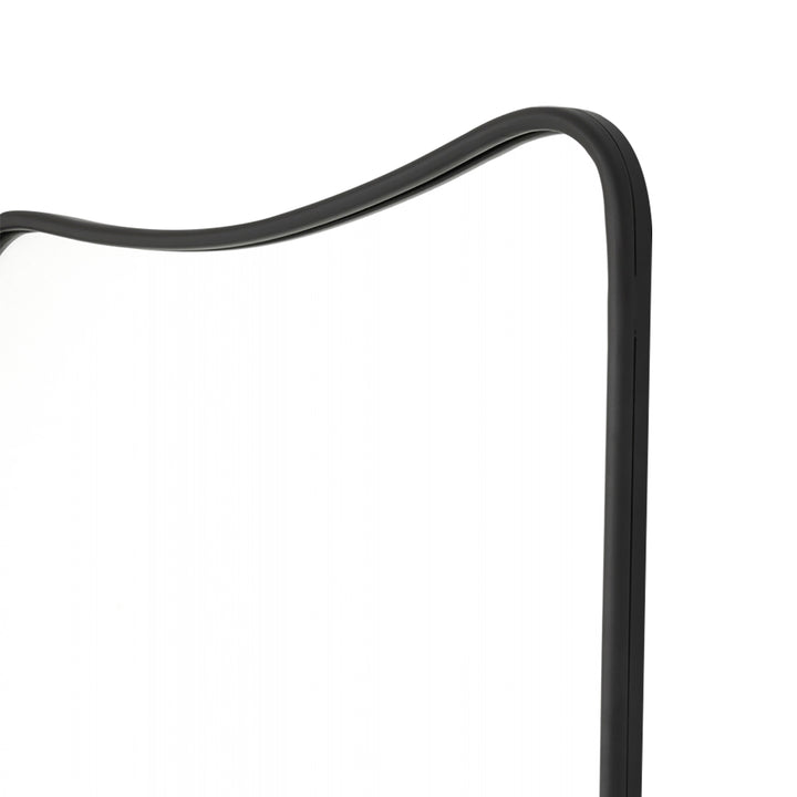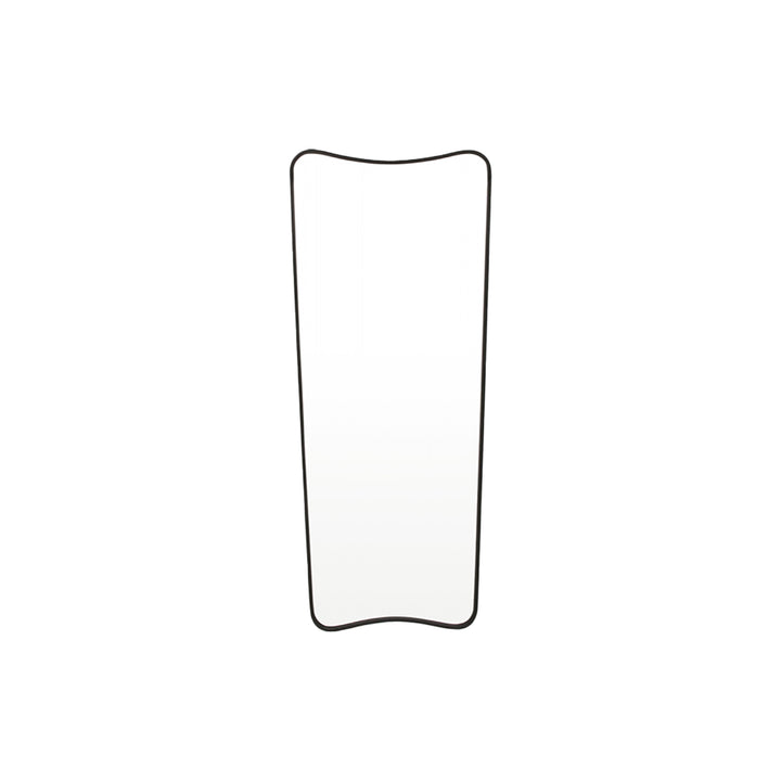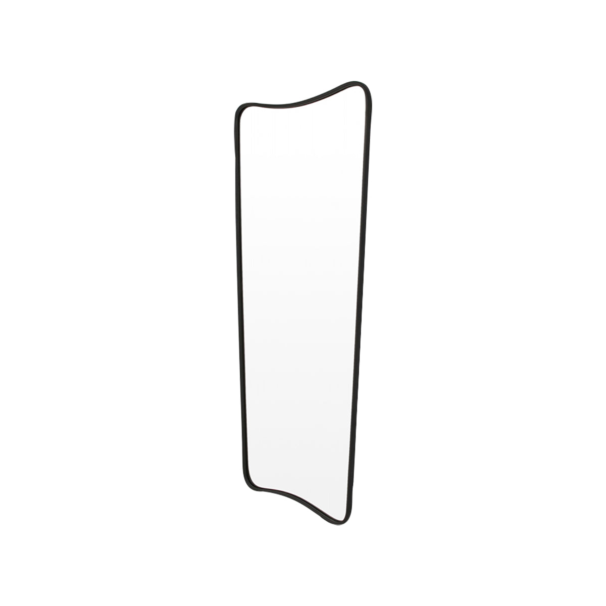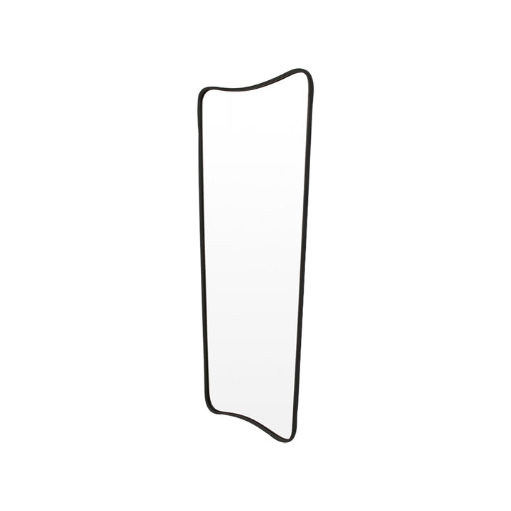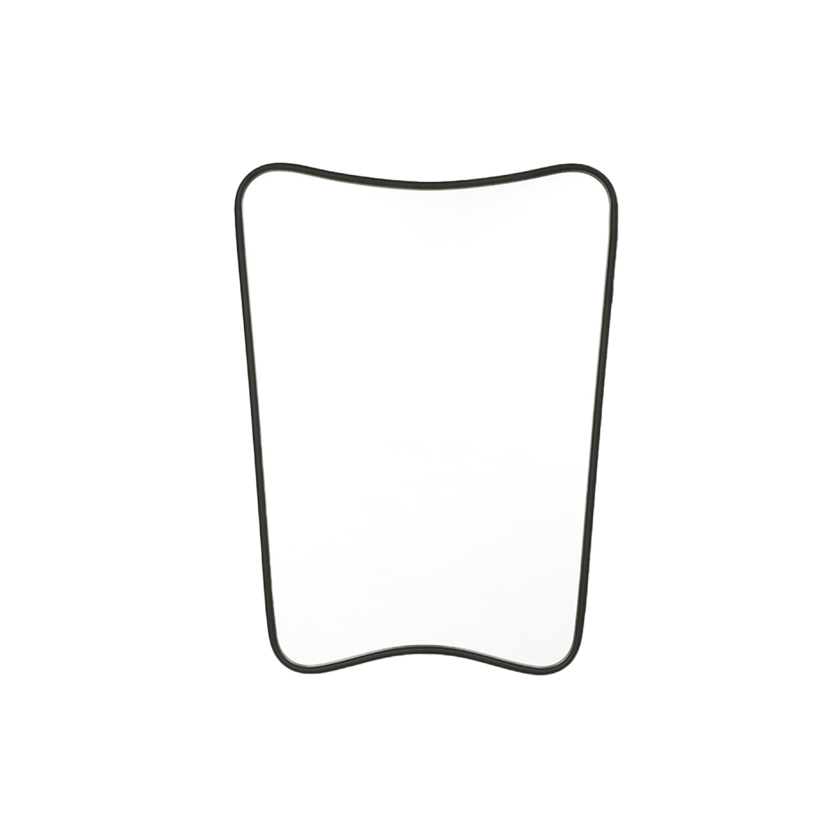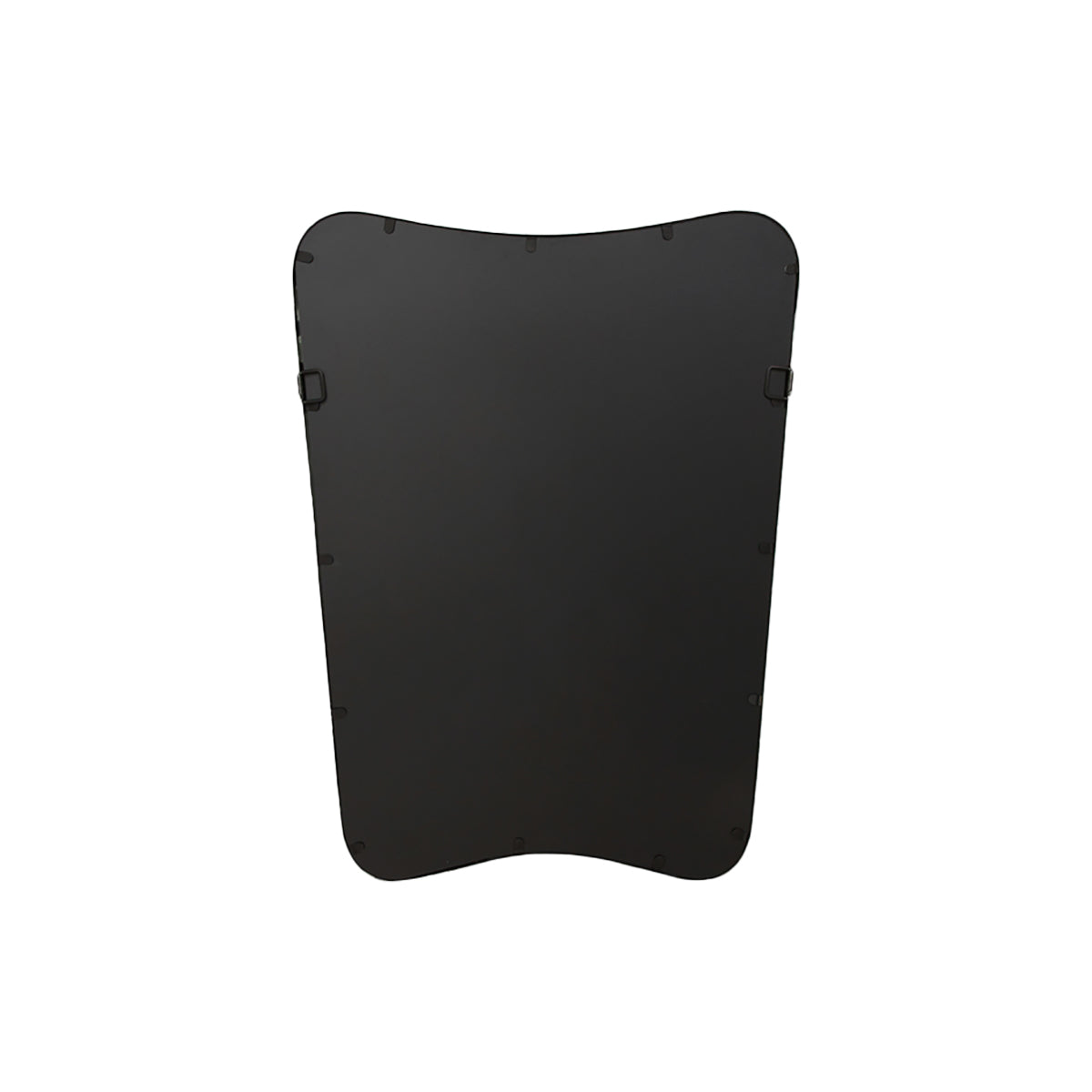 Mirrored glass, iron frame, engineered wood backing, fitted with D rings for hanging, top of mirror is 71cm wide, base of mirror is 58cm wide, contacting a professional hanger is advised to install your mirror with the correct fixtures for your wall type.