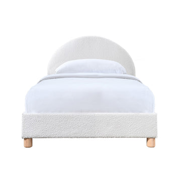 Boucle upholstery, arched design, timber legs, available in various sizes.