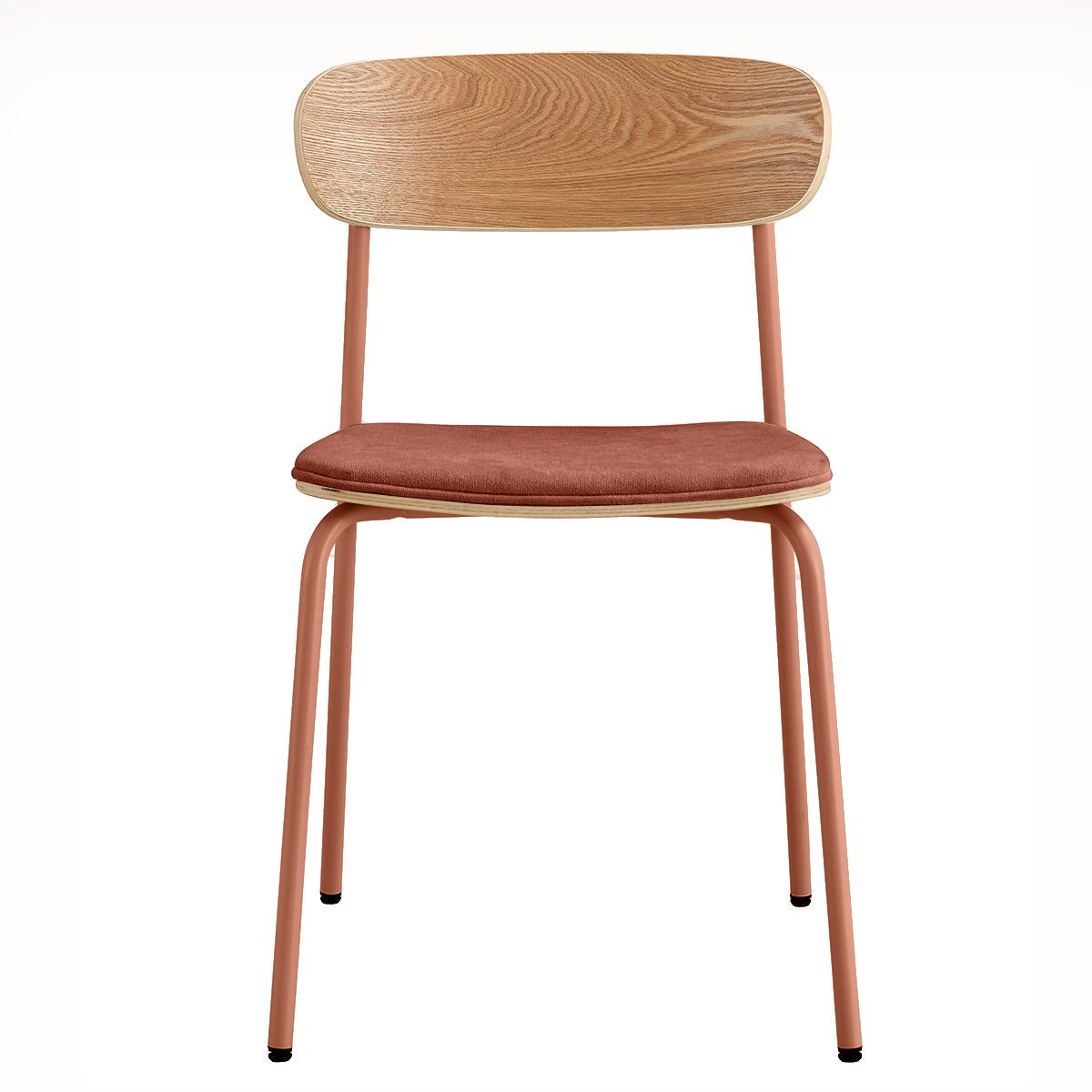 Cream metal frame, ash timber backrest, fabric upholstered seat.