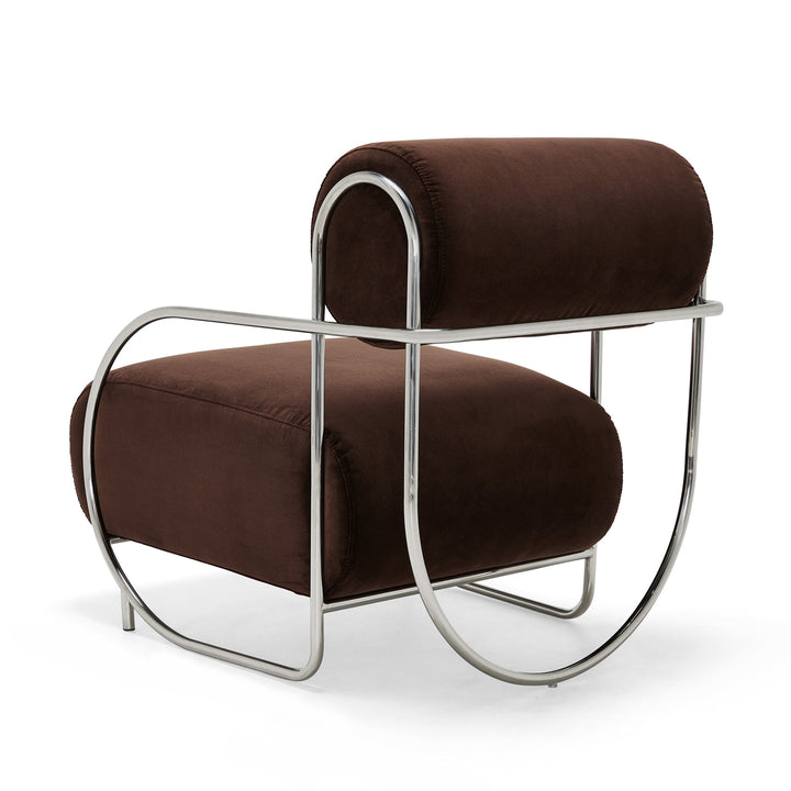 Designed by Sarah Ellison for ELLISON STUDIOS., polished stainless-steel frame, bolster cushioning, upholstery belt suspension seating, available in various finishes, pair with matching ottoman.