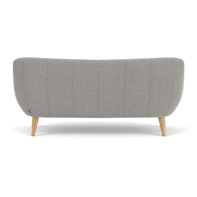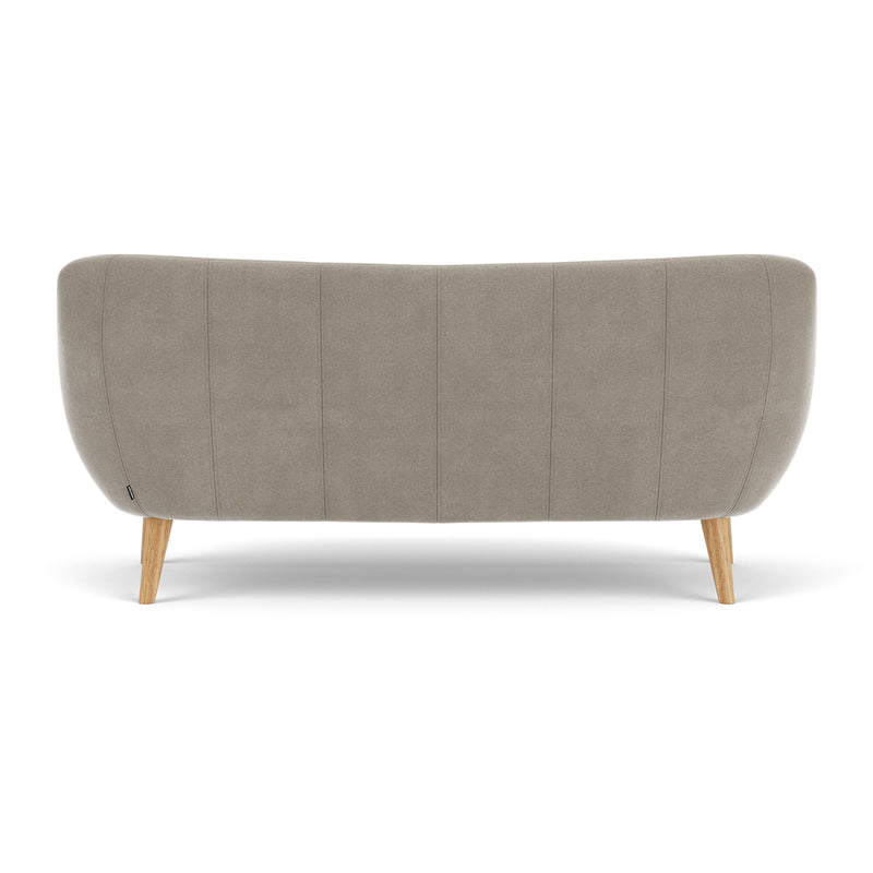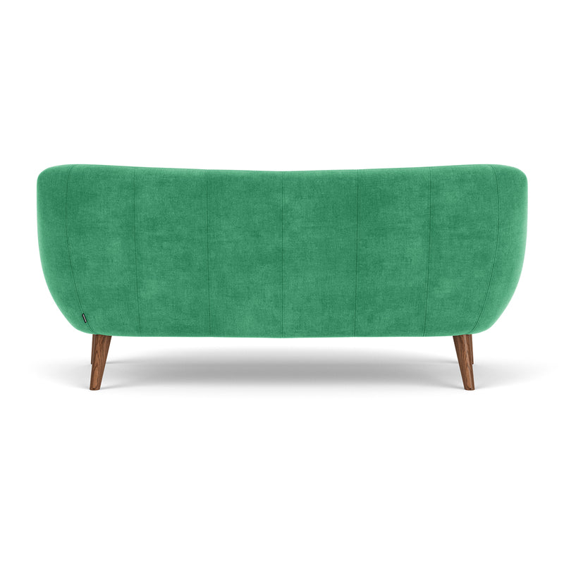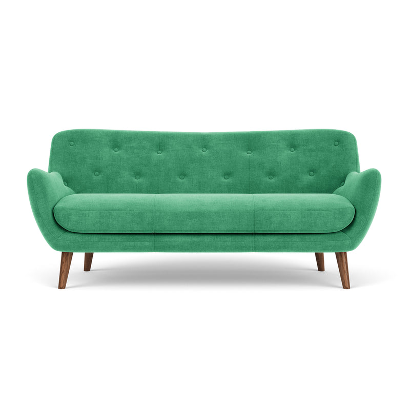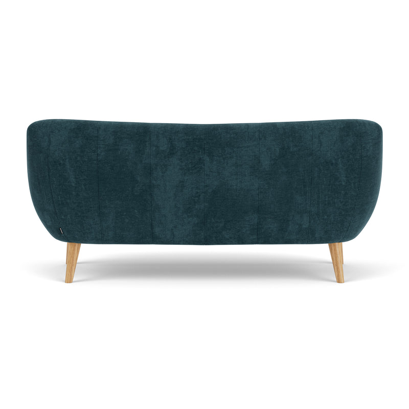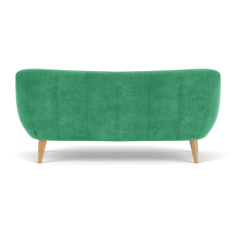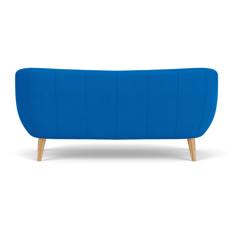 3 seater, fabric upholstery, wooden legs available in oak or walnut, curved shape, various colourways available, various finishes available.