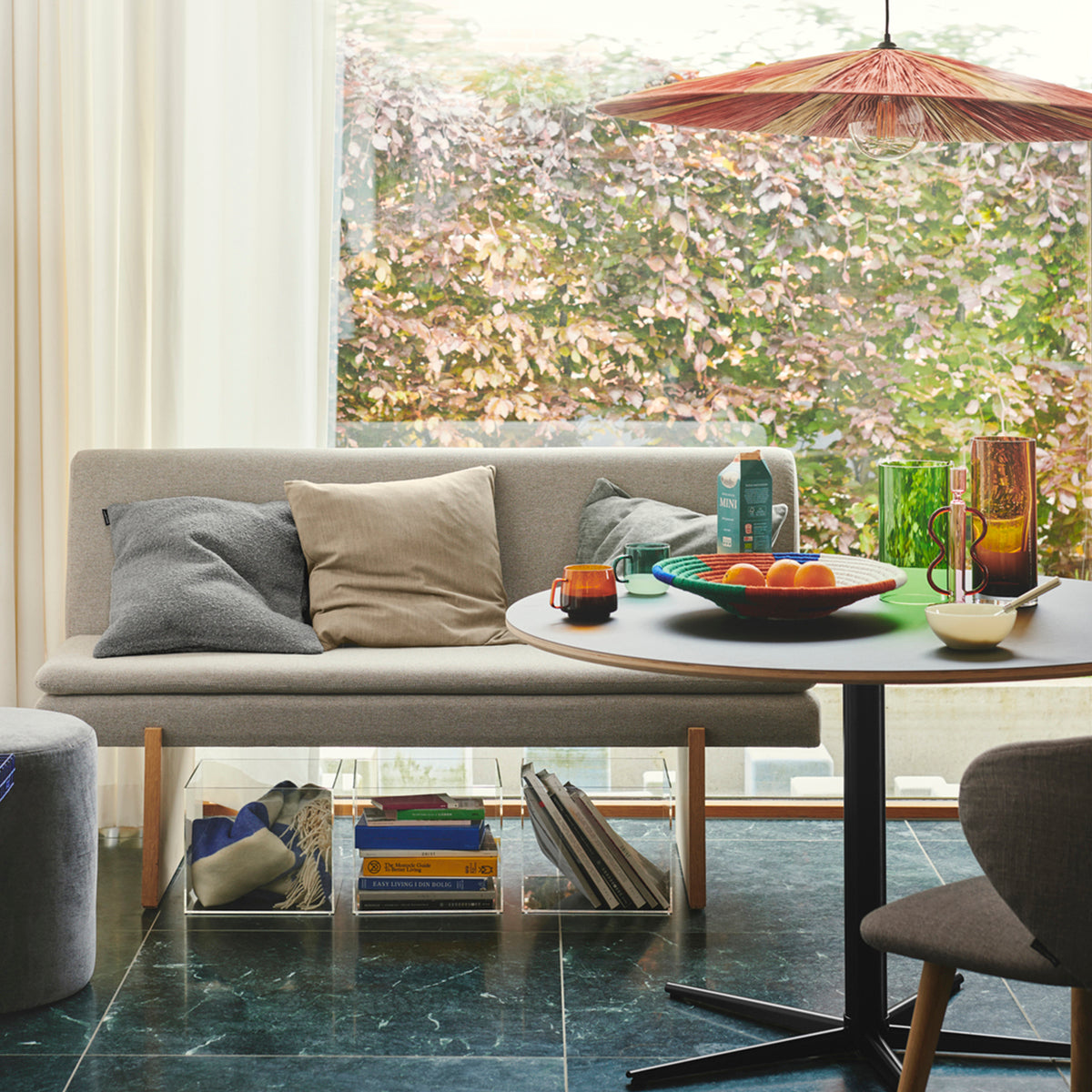 Fabric upholstery, oak veneer legs, recycled polyester/polyester blend, various colourways available.
