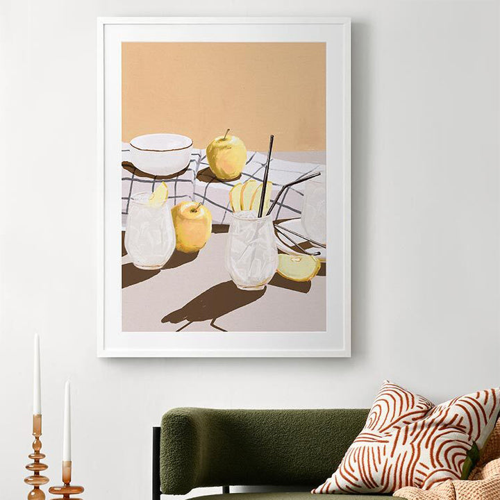 Apple Juice Art Print - Quench that summer thirst with a cold glass of freshly squeezed apple juice. Bring some summer energy to your space with this gorgeous piece, capturing a moment in time on a busy outdoor dining table with fresh apples, a few tall drinks, and the favourite tablecloth lying underneath the morning sun. A colour palette of soft yellow, beige, white and grey complement any interior design style.