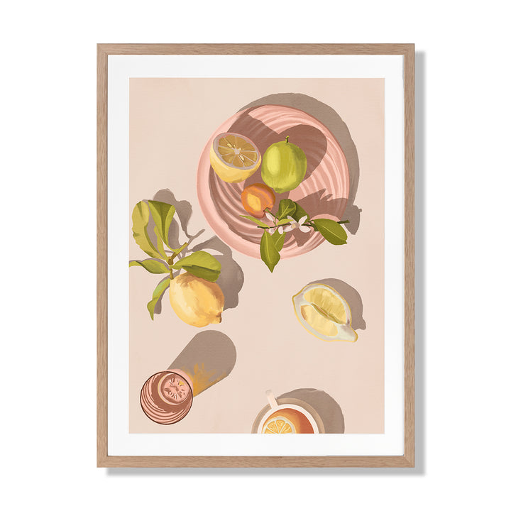 Citron Art Print - A glimpse into the other side of a freshly squeezed glass of lemonade, this piece brings a light energy to your space with softened textures and colours. Against a muted pink backdrop, bright yellow and lime green shades pop, with some dark green, a hint of orange, and a darker pink used to tie everything together for the ultimate fresh summer feel. Shadows help add depth to the artwork, whilst reminding you of the comforting warmth of a hot summer's day.