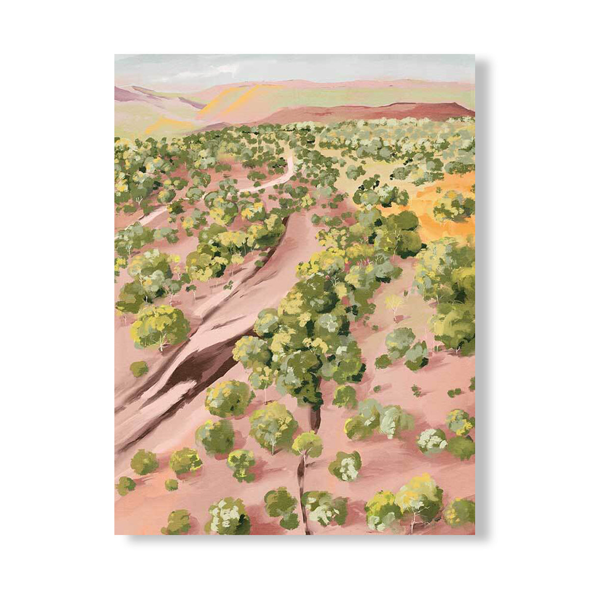 Over The Hill Canvas Art Print - We're taken here on a journey, over the hill, and far away. Rich earthy tones of dusty brown earth, golden grasses and a hundred hues of green. The painterly quality and soft brushstrokes are seemingly simple yet highly skilled in application, further enhancing this glorious landscape artwork. Perfect as a standalone wall hanging or harmonious enough to include in a series.