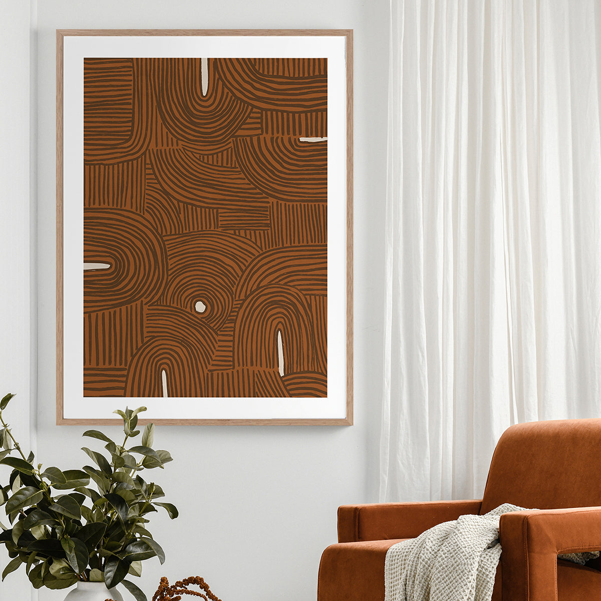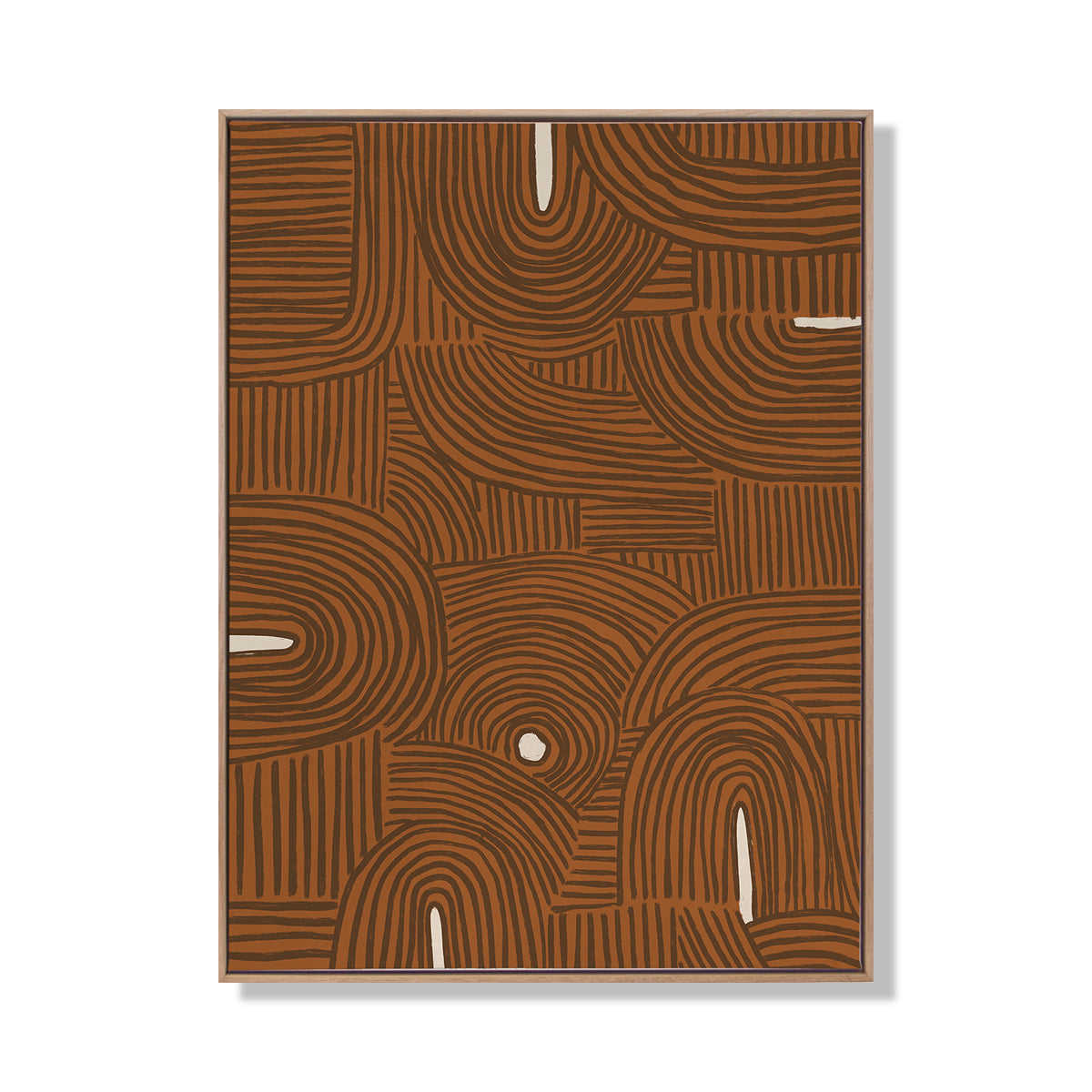 Pathways Canvas Art Print - All of us are on our own path, but many of us meet those we love along the way. A mesmerizing abstract piece, this artwork features detailed linework, compiled to form a random pattern, no two lines the same to bring a relaxed look and feel. Palette includes a terracotta brown backdrop, with brown lines and touches of creamy white.