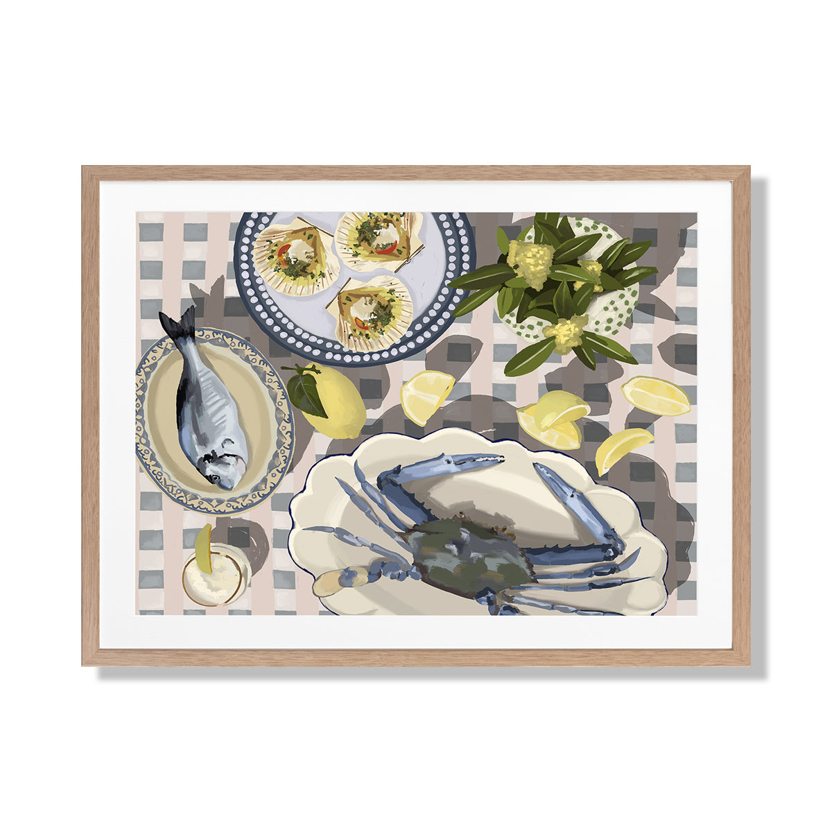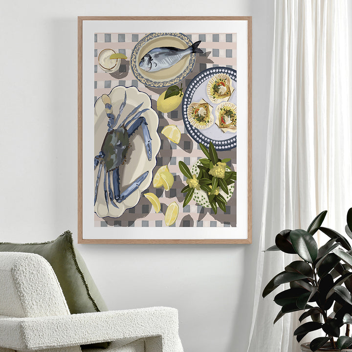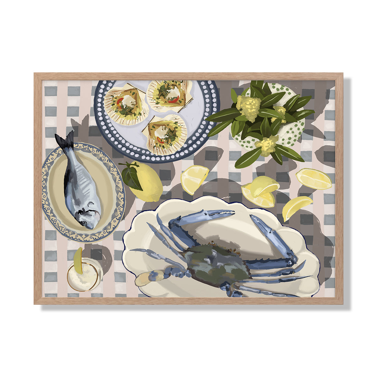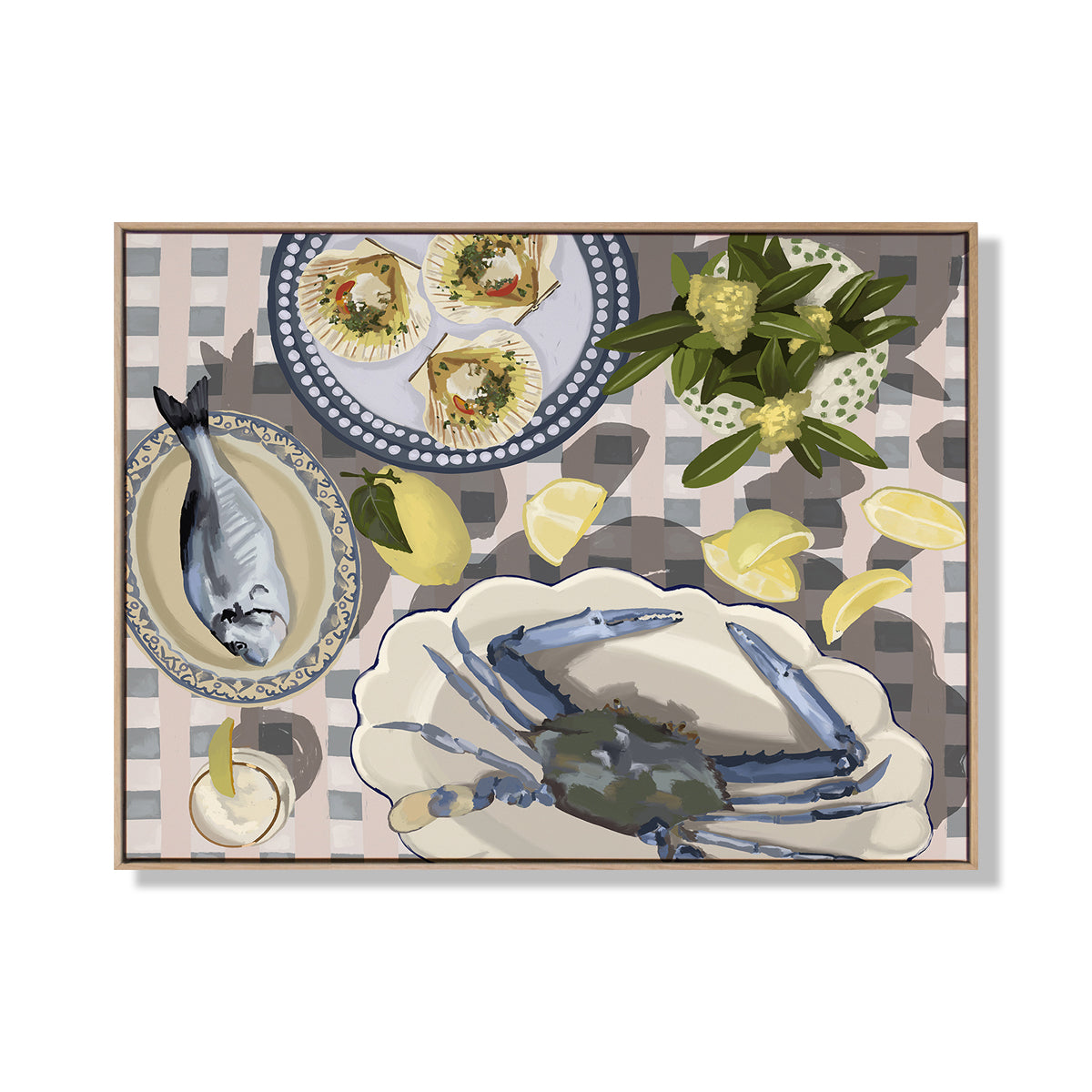 Sunset Feast Canvas Art Print - As the sun begins to set, endless varieties of seafood make their way out onto the alfresco table, casting shadows onto the checkerboard tablecloth as a reminder to eat while it's fresh. Crabs, scallops and fish are honoured with delicate porcelain plates, slices of lemon waiting for their moment to bring the meal together. A soft palette featuring pastel yellow, blue, lilac, green and white makes this a versatile piece for any room.
