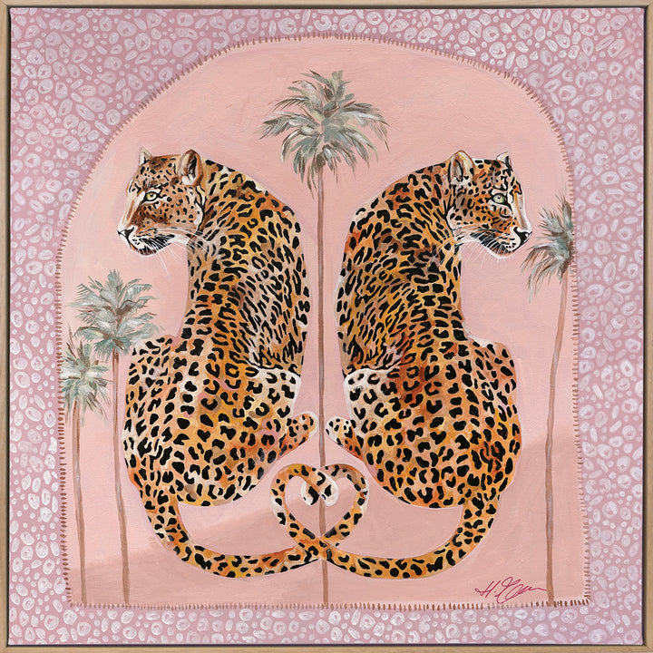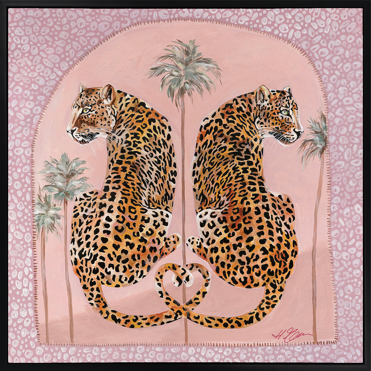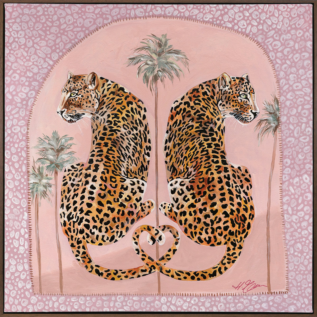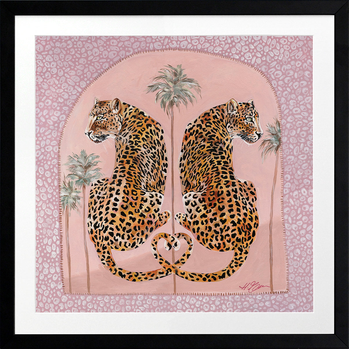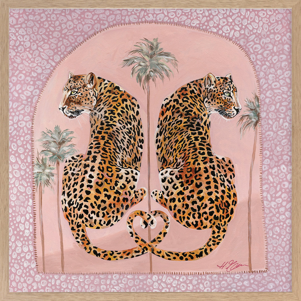Fun and inviting, this boho-inspired Synchronicity Art Print features two leopards side-by-side, enjoying a moment among the palm trees on a warm summers night. A bright palette of pink tones, green, orange, and dark yellow complements funky shapes and patterns throughout the work. Urban Roads range of artworks are perfect to uplift your home, fill that empty wall, or add an extra layer of texture and comfort.